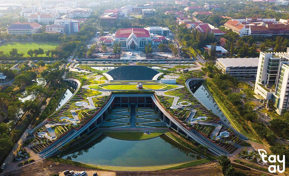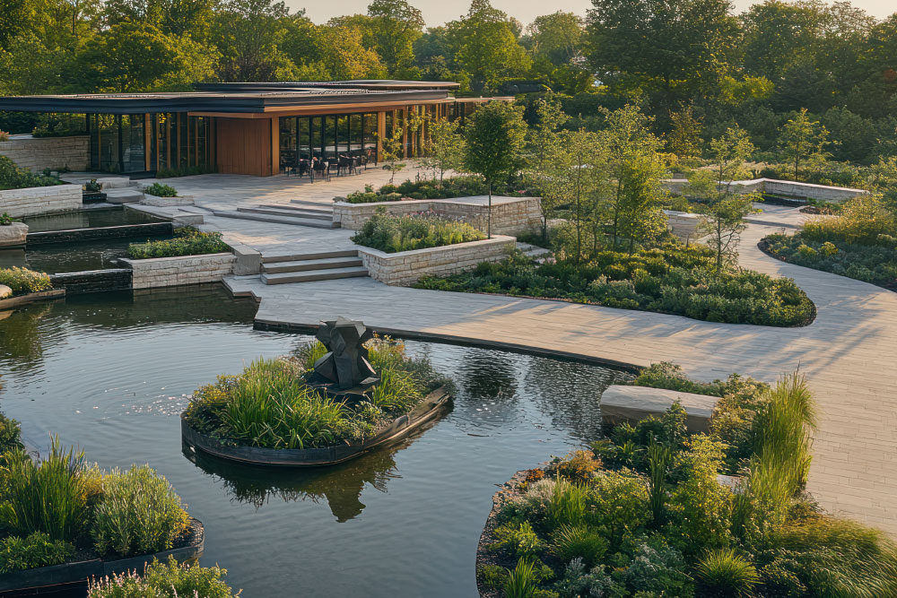 Lấy thiên nhiên làm trung tâm, sử dụng cây bản địa, hồ nước, lối dạo và bãi cỏ rộng lớn, thể hiện sự sang trọng, gần gũi.